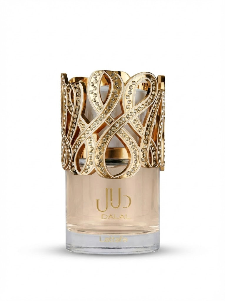 Dalal da Lattafa é uma fragrância unissex que personifica a opulência e a doçura sofisticada. Abrigado em um frasco adornado com um intrincado design dourado cravejado de cristais, este perfume é uma celebração do luxo árabe, fundindo notas frutadas suculentas com um fundo cremoso e gourmand.